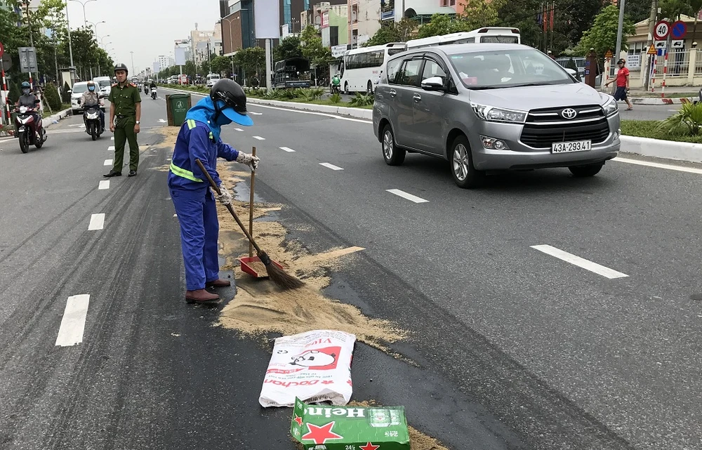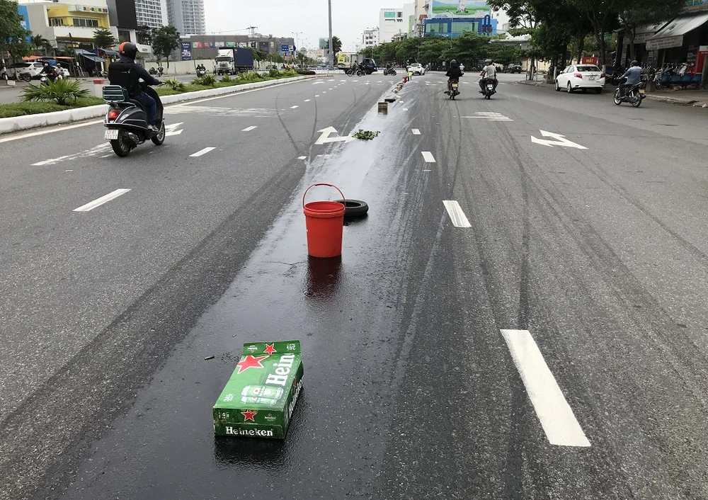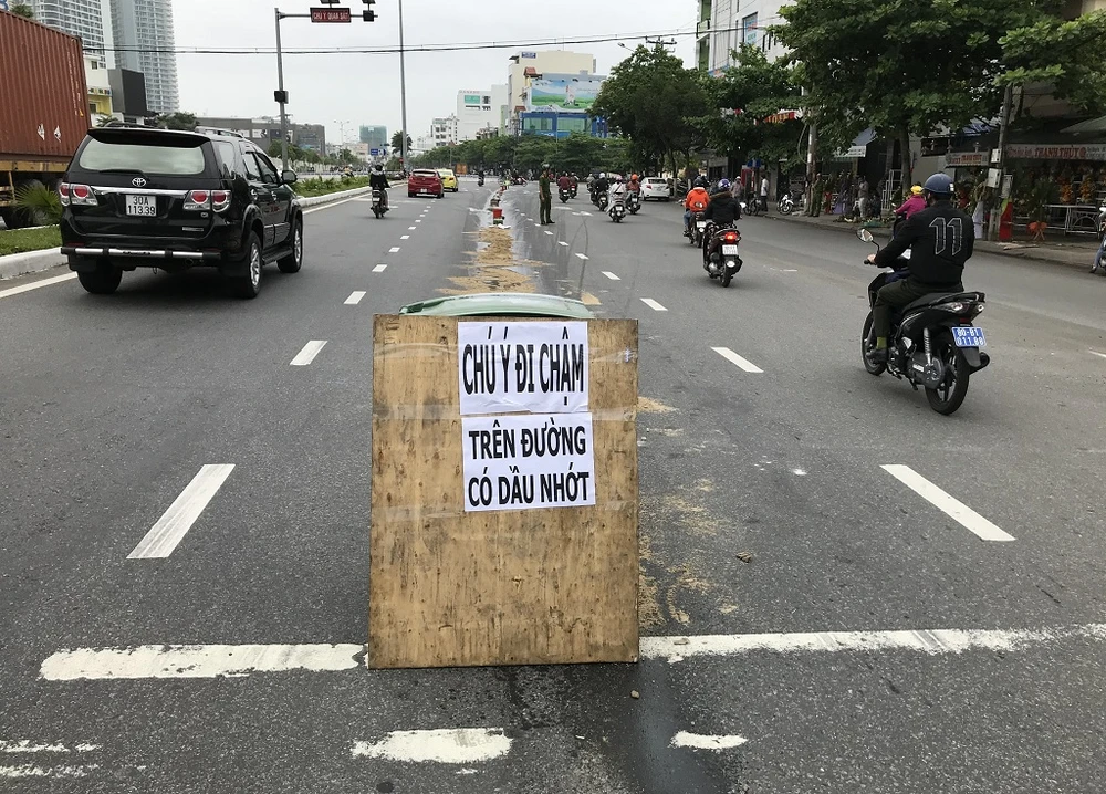 Khoảng 8 giờ ngày 9-4, nhiều người đi xe máy trên đường Ngô Quyền hướng từ Ngũ Hành Sơn đi trung tâm TP, khi đến đoạn giao nhau với đường Nguyễn Thông thì gặp nhớt của một xe tải đổ rải trên đường trước đó. Họ loạng choạng tay lái, ngã bổ nhào trên đường.