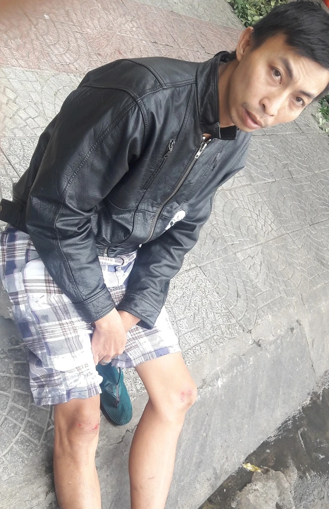Anh Vũ cố thắng xe lại nhưng không giữ được thăng bằng nên ngã nhào.Nạn nhân bị trầy hai chân, xe máy hư hỏng.