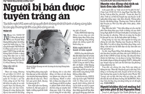 Pháp Luật TP.HCM ngày 9-4 có bài “Người bị bắn được tuyên trắng án” phản ánh TAND TP Cà Mau vừa tuyên anh Huỳnh Nhật Quang không phạm tội chống người thi hành công vụ. Tòa kiến nghị VKSND tỉnh Cà Mau xem xét lại việc không khởi tố hành vi dùng súng bắn đạn cao su bắn anh Quang gây thương tích của Phó Công an xã Tắc Vân (TP Cà Mau) Dương Trí Dũng. Nhiều bạn đọc cho rằng nhận định của tòa là rất xác đáng.