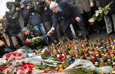 Ngoại trưởng Mỹ John Kerry đặt hoa viếng những người biểu tình thiệt mạng tại quảng trường Độc lập ở thủ đô Kiev (Ukraine) ngày 4-3. Ảnh: AP
