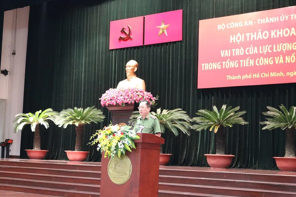 Thượng tướng Nguyễn Văn Thành, Thứ trưởng Bộ Công an, phát biểu khai mạc hội thảo. Ảnh: THANH TUYỀN