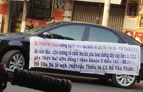 Khoảng 7 giờ sáng 16-2, bà Huỳnh Thị Lệ Trinh, chủ khách sạn 2222 (phường 5, TP Mỹ Tho, Tiền Giang), đã lái xe ô tô chạy quanh một số tuyến đường tại hai phường 1 và 5, bên hông ô tô có giăng băng rôn ghi dòng chữ: “Bà Trinh - khách sạn 2222 cương quyết yêu cầu khởi tố Hồ Văn Bá - Phó Bí thư Đảng ủy phường 1 đã cầm đầu, chủ trương tổ chức lén lút phá hoại đường dây điện khách sạn 2222 gây thiệt hại 28 triệu đồng (theo khoản 2 Điều 141 BLHS). Hồ Văn Bá là anh ruột của Thiếu tá Hồ Văn Phước”.