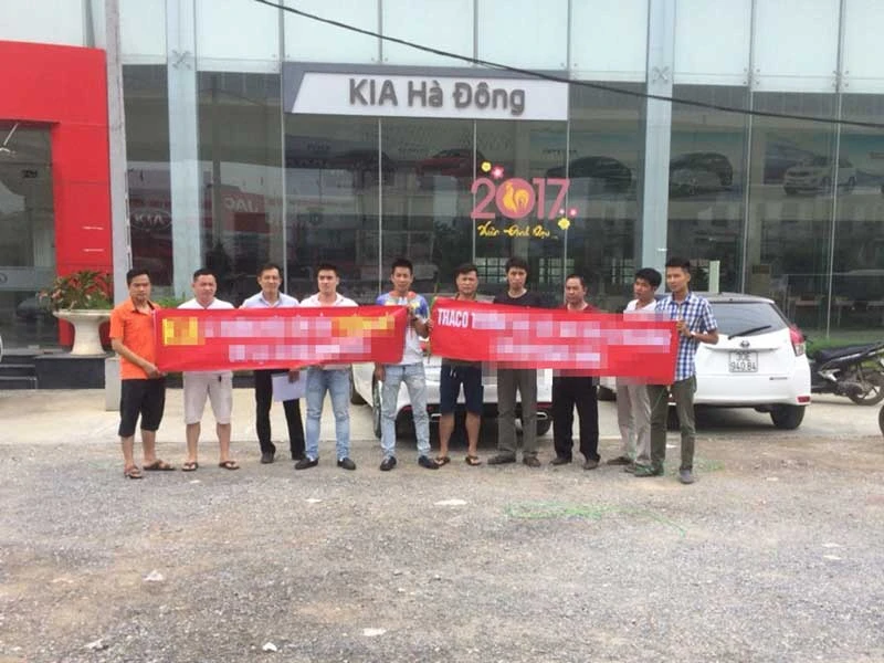 Khách hàng căng băng rôn đòi Kia Hà Đông giao xe. Ảnh: VIẾT LONG