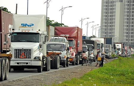 Dòng xe nối đuôi trên nhiều tuyến đường bên ngoài cảng Cát Lái. Ảnh: MP