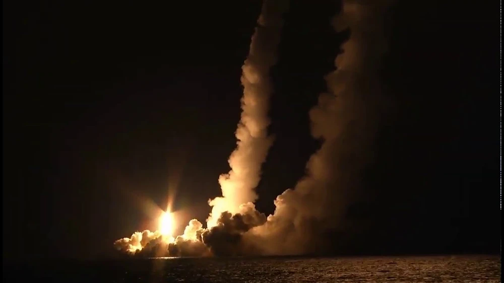 Tàu ngầm Vladimir Monomakh phóng tên lửa Bulava ở Thái Bình Dương hôm 12-12. Ảnh: TASS