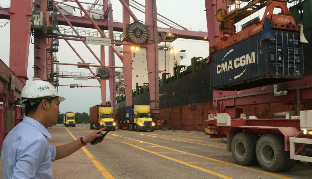 Lúc 18 giờ ngày 15-3, những container hàng đầu tiên từ cảng SP-ITC được bốc lên tàu Eagle để chuyển thẳng từ khu vực cảng Phú Hữu, quận 9, TP. HCM đi trực tiếp đến các cảng của Australia.