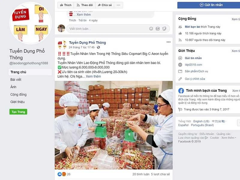| Big C, Vincom, Co.opmart… không tuyển dụng qua kênh trung gian Mới đây, Phòng LĐ-TB&XH quận Gò Vấp cũng phát hiện trên Facebook xuất hiện trang có tên “Tuyển dụng phổ thông”. Tại đây có rất nhiều thông tin tuyển dụng việc làm cho các hệ thống siêu thị như Big C, Vincom, Co.opmart, Emart. Tuy nhiên, đại diện các doanh nghiệp này tại buổi làm việc với Phòng LĐ-TB&XH đều khẳng định không liên kết với đơn vị tuyển dụng lao động nào và chỉ đăng tin tuyển dụng trên kênh chính thức của đơn vị mình. |
