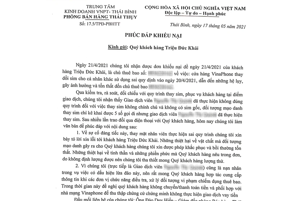 | Nân viên nhà mạng làm sai quy trình Cả hai trường hợp nêu trên, trong quá trình làm việc với khách hàng, nhà mạng đã xác nhận giao dịch viên khi thực hiện thủ tục cấp lại SIM chỉ yêu cầu khách hàng cung cấp năm số điện thoại gọi đi và gọi đến, cam kết quyền chủ sở hữu thuê bao là không đúng quy trình. Trong văn bản trả lời khiếu nại mới đây của Trung tâm VNPT huyện Thái Thụy, Thái Bình đối với anh Triệu Đức Khải nêu rõ vì sự cố đáng tiếc này Trung tâm VNPT huyện Thái Thụy đã gửi lời xin lỗi tới khách hàng. Những thiệt hại về vật chất mà các đối tượng mạo danh gây ra cho khách hàng, trung tâm sẽ khắc phục và bồi thường tổn thất. Còn đối với trường hợp của chị ATH, phía VNPT TP.HCM cho biết sẽ đồng hành cùng khách hàng để cung cấp các thông tin cần thiết phục vụ cho cơ quan điều tra. VinaPhone cũng từng phát đi cảnh báo hiện tượng lừa đảo chiếm đoạt quyền kiểm soát SIM thuê bao di động để đánh cắp thông tin mã OTP, sau đó rút tiền từ thẻ tín dụng của khách hàng hoặc vay tiền online. Đồng thời, VinaPhone cũng đã khuyến cáo khách hàng thực hiện các biện pháp nhằm bảo mật thông tin và các lưu ý kèm theo. |