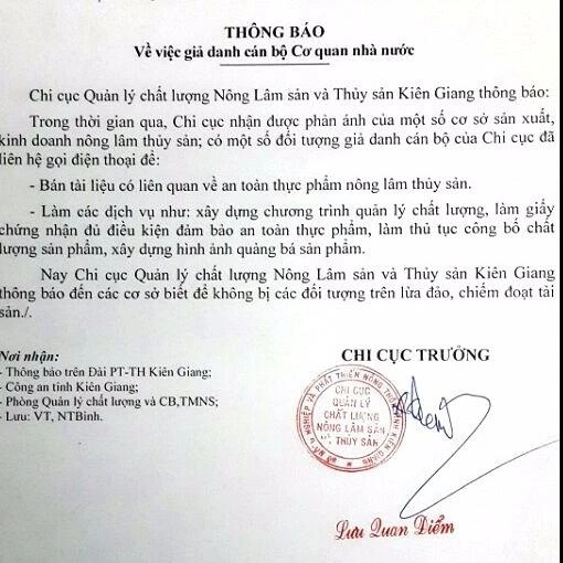 Chiều 12-10, ông Lưu Quan Điểm, Chi cục trưởng Chi cục Quản lý chất lượng nông lâm thủy sản Kiên Giang, vừa ký công văn thông báo về một số đối tượng giả danh cán bộ của chi cục để gọi điện thoại bán tài liệu có liên quan về an toàn thực phẩm (ATTP) nông lâm thủy sản, làm dịch vụ để cấp giấy chứng nhận đảm bảo ATTP… Chi cục Quản lý chất lượng nông lâm thủy sản Kiên Giang ra thông báo gửi các cơ quan, cơ sở sản xuất, kinh doanh và người dân nắm rõ thông tin để tránh không bị lừa đảo chiếm đoạt tài sản.