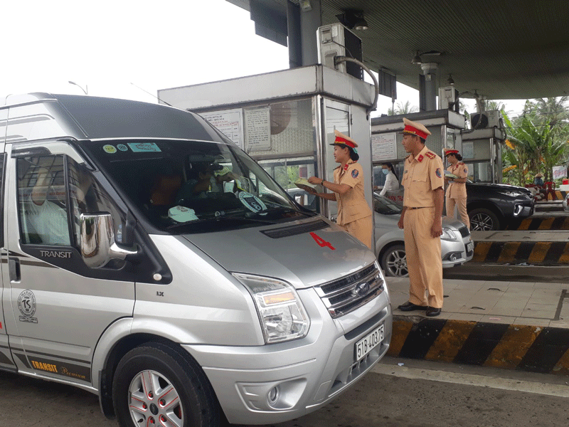 CSGT Công an tỉnh Bến Tre phát tờ rơi tại trạm thu phí cầu Rạch Miễu cho các tài xế.
