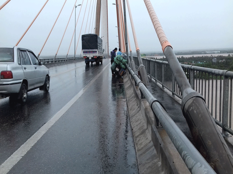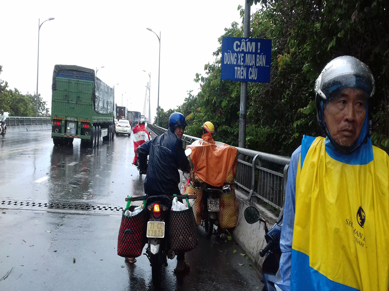 Nhiều người đi xe máy không dám lên cầu Rạch Miễu mỗi khi mưa giông.