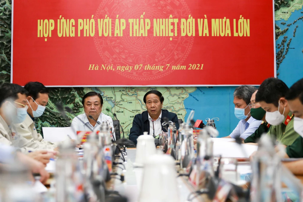 Phó thủ tướng Chính phủ Lê Văn Thành (bên phải) và Bộ trưởng Bộ NN&PTNT Lê Minh Hoan đồng chủ trì cuộc họp ứng phó với áp thấp nhiệt đới chiều 7-7. Ảnh: Hiền An