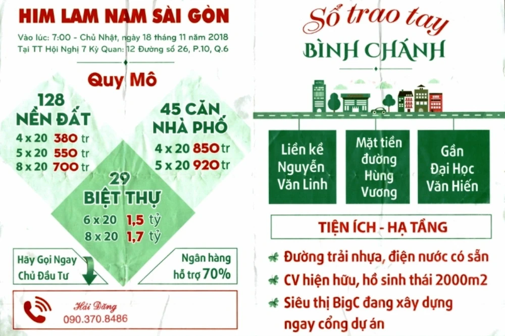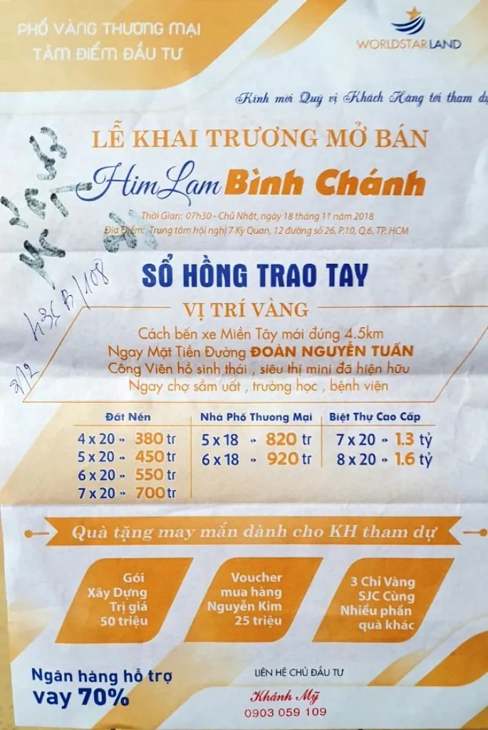 Thông tin về các dự án này được cung cấp bởi một số nhân viên môi giới bất động sản tự do thông qua hình thức phát tờ rơi quảng cáo và mời liên hệ qua điện thoại… Đỉnh điểm là “Lễ khai trương mở bán Him Lam Bình Chánh” được công khai tổ chức tại Trung tâm hội nghị 7 Kỳ Quan vào ngày 18-11-2018 vừa qua. Đáng lưu ý, vào cùng ngày và cùng thời điểm, dự án mang tên “Him Lam Nam Sài Gòn” cũng tổ chức một hoạt động mở bán, giới thiệu sản phẩm tại địa điểm trên.