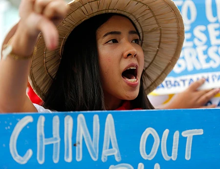 Biểu tình trước sứ quán TQ ở Manila (Philippines) hôm 18-2 để phản đối TQ triển khai tên lửa ở biển Đông. Ảnh: EPA.