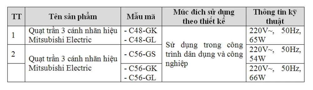 Các sản phẩm quạt trần 3 cánh nhãn hiệu Mitsubishi Electric do Công ty TNHH Mitsubishi Electric Việt Nam nhập khẩu và phân phối đều có thể dính nguy cơ này.