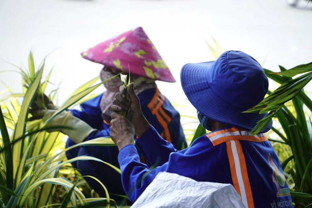 | Vào những ngày này, những chiếc nón lá, nón tai bèo là một trong những vật dụng không thể thiếu của những công nhân làm việc ngoài trời. Ảnh: Huỳnh Thơ |