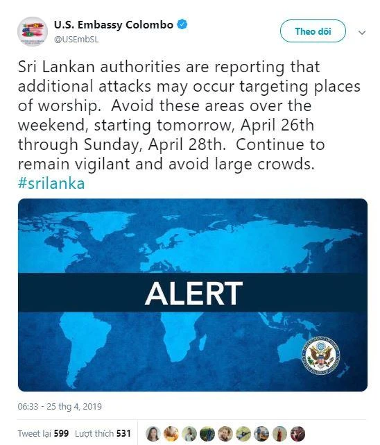 “Tiếp tục duy trì cảnh giác và tránh xa các khu vực đông người”, dòng Twitter của Đại sứ quán Mỹ tại Sri Lanka chia sẻ.