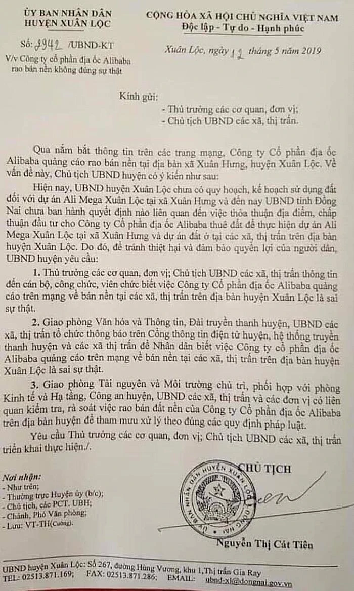 Mới đây, UBND huyện Xuân Lộc, tỉnh Đồng Nai đã có công văn gửi thủ trưởng các cơ quan, đơn vị, Chủ tịch UBND các xã, thị trấn đề nghị cảnh báo, kiểm tra, rà soát việc Công ty Cổ phần địa ốc Alibaba rao bán nền không đúng sự thật trên địa bàn huyện.