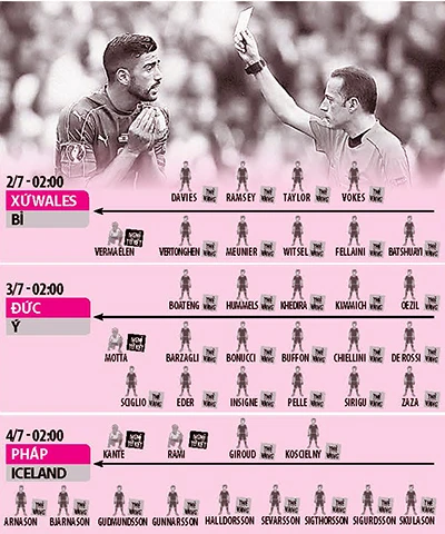 Trước mắt là đội chủ nhà Pháp ở vòng tứ kết sẽ thiệt quân đáng kể khi hai trụ cột là tiền vệ phòng ngự Kante và trung vệ Rami sẽ không được ra sân trong trận gặp Iceland. Tương tự nhưng số lượng thiệt thòi ít hơn là đội tuyển Ý và Bỉ. Nếu Ý thiệt quân khi tiền vệ Motta đã nhận đủ hai thẻ vàng, không thể ra sân trong trận quan trọng gặp Đức thì Bỉ sẽ vắng trụ cột Vermaelen cũng vì nhận đủ hai thẻ vàng.