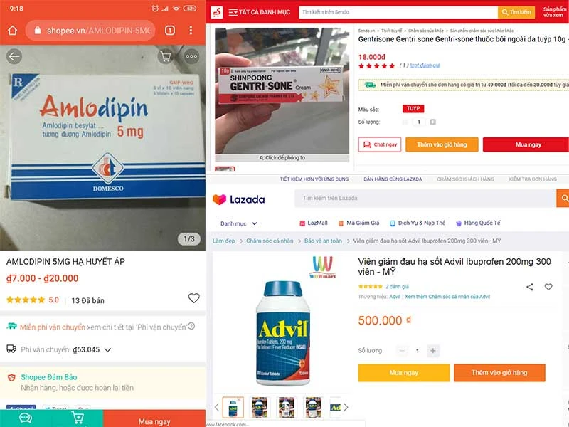 Các loại thuốc kê đơn được bán trên các sàn Sendo, Lazada, Shopee. Ảnh: HL