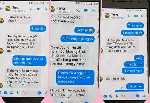 Nhiều tin nhắn có nội dung thầy giáo T “gạ tình” nữ sinh này như “Chết thôi, ngày không nói chuyện được với em một chút là thầy không chịu được, làm sao bây giờ” hay “Lúc nào em cũng có cảm giác nhớ thầy như thầy nhớ em thì hãy chạy nhanh đến bên thầy nhé. Thầy luôn chờ em”.