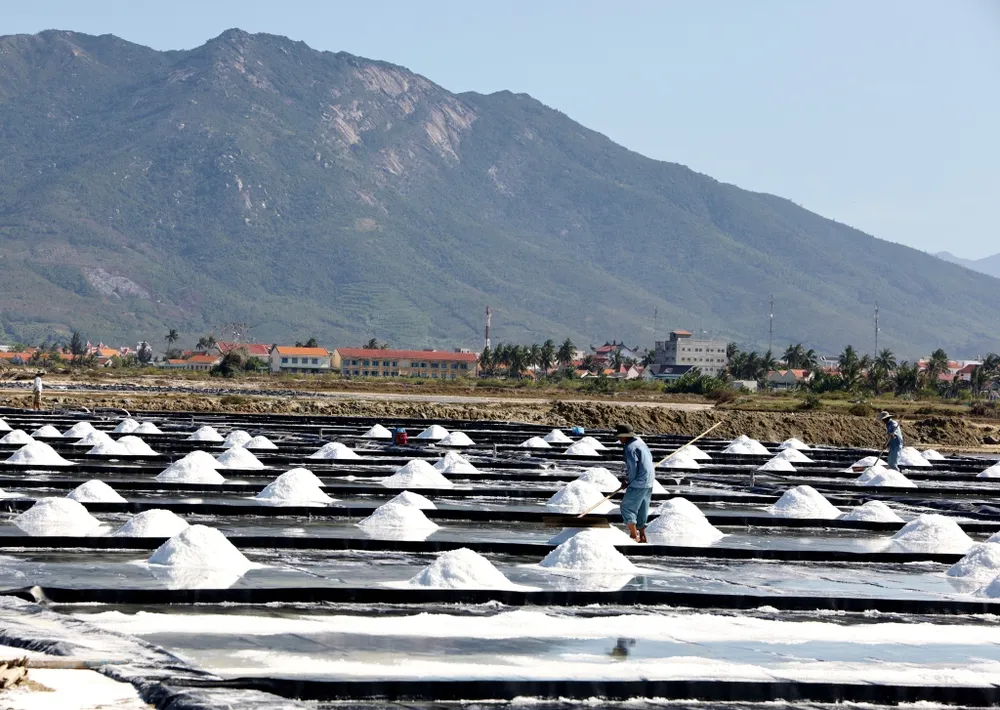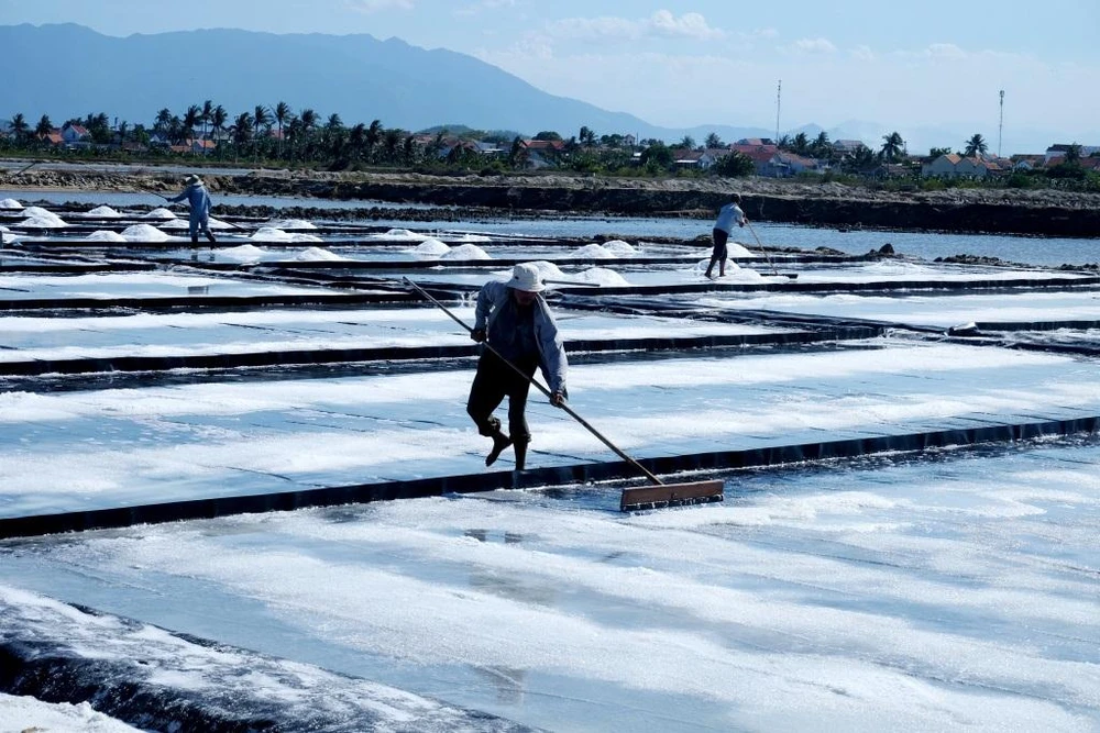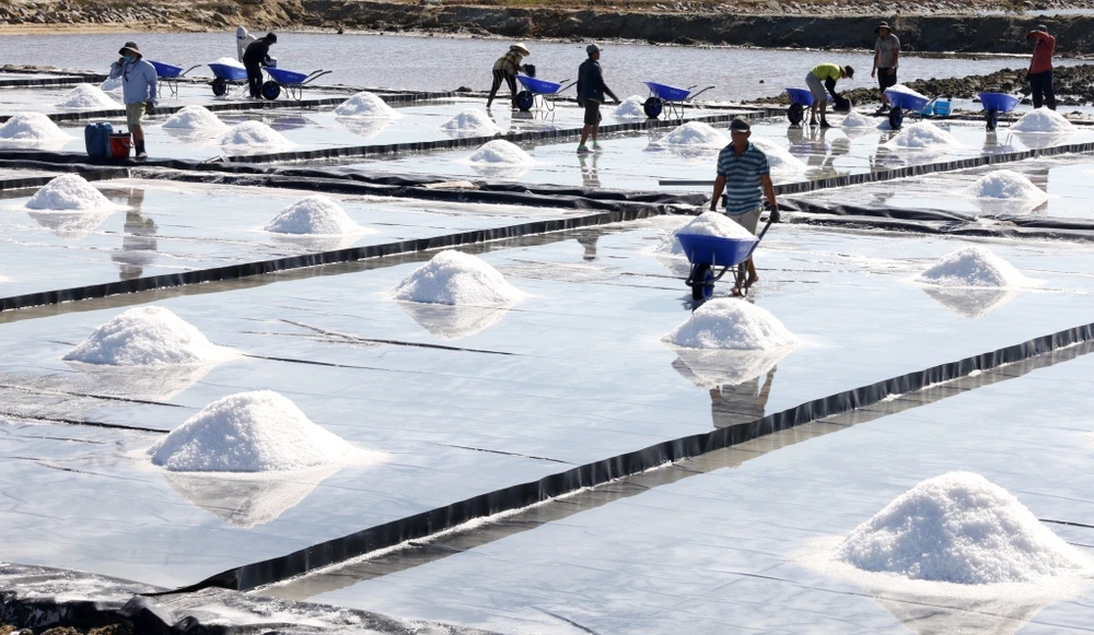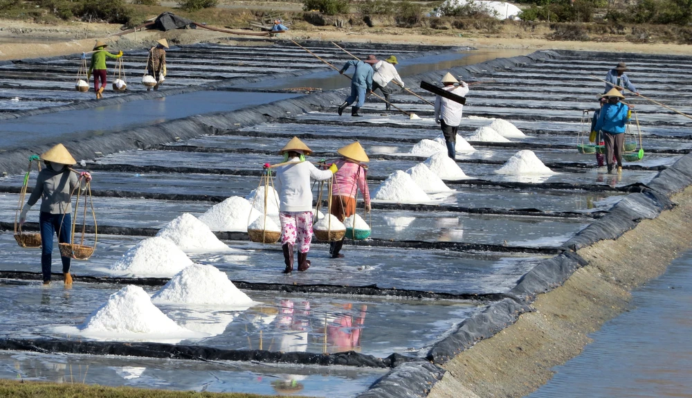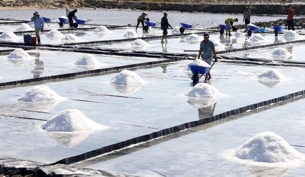 Người dân thu hoạch muối ở Ninh Diêm.