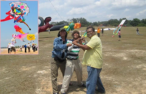 Ông Vân (giữa) cùng những thành viên CLB Phượng Hoàng đang thả diều nghệ thuật (ảnh nhỏ).