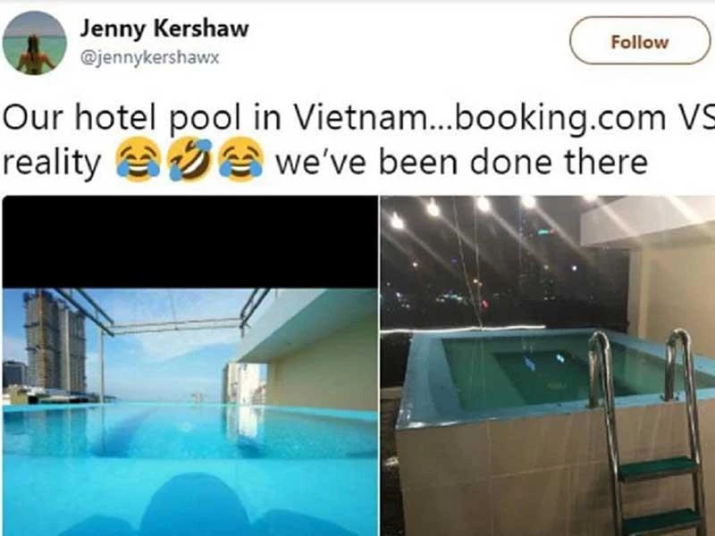 Vì thấy hồ bơi được quảng cáo khi đặt phòng trực tuyến quá đẹp (bên trái) nên một du khách đặt phòng và than trời với thực tế hồ bơi quá tệ (bên phải). Ảnh: TRÚC PHƯƠNG