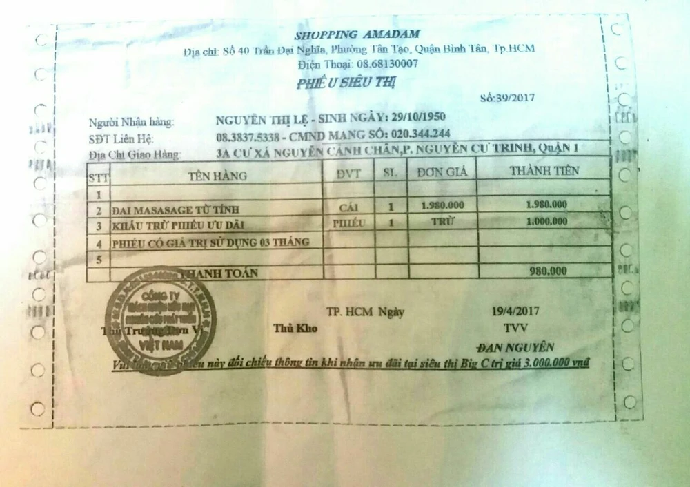 Cụ thể như trường hợp khách hàng Nguyễn Thị L. mang đến "phiếu siêu thị", trên tờ này có thông tin là Shopping Amadam, địa chỉ 40 Trần Đại Nghĩa, quận Bình Tân, TP.HCM.