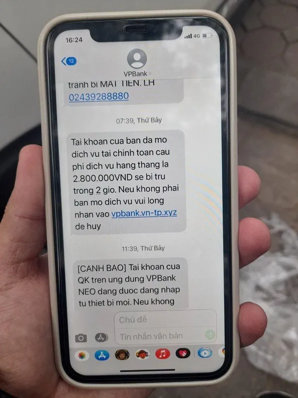 Một trong số các nội dung tin nhắn lừa đảo có nội dung “Tài khoản của quý khách vừa mở dịch vụ tài chính toàn cầu với phí dịch vụ hàng tháng là 2.800.000 VND sẽ bị trừ trong hai giờ. Nếu không phải bạn mở dịch vụ, vui lòng nhấn vào vpbank.vn-tp.xyz để hủy”.
