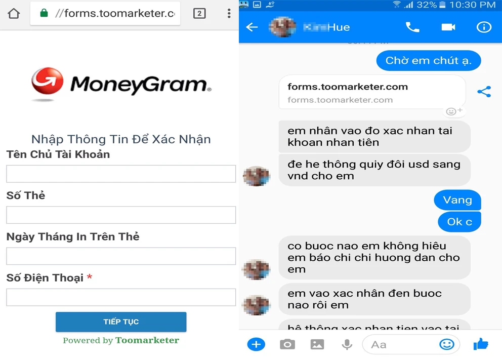 Sau khi trao đổi, cho biết đã xuất tiền để chuyển về Việt Nam, tài khoản T.K Hue gửi cho người bán một đường link, yêu cầu người bán điền thông tin tài khoản nhận vào mẫu có sẵn để kênh thanh toán hoàn tất chuyển tiền. Thực chất đường link này không phải của tổ chức tín dụng hay ngân hàng nào cả mà do các đối tượng lừa đảo tự lập ra để thu thập thông tin đối phương.