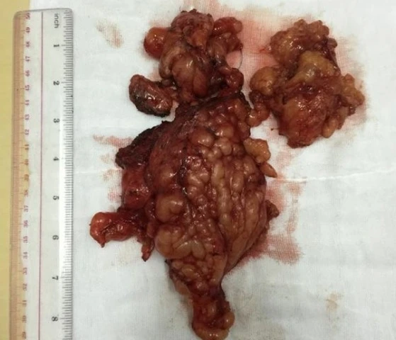 Các bác sĩ đã quyết định phẫu thuật cho bệnh nhân N.A. Ca phẫu thuật kéo dài hơn 3 tiếng, kíp mổ đã bóc toàn bộ khối u, giải phóng chèn ép cho bệnh nhân. Khối u được lấy ra cân nặng gần 2kg. Quá trình hậu phẫu diễn tiến thuận lợi, bệnh nhân N.A được xuất viện sau hơn 1 tuần.