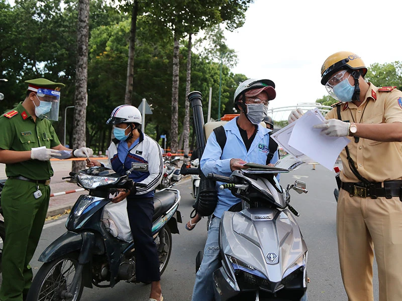 Lực lượng chức năng kiểm tra, xử lý các trường hợp người dân ra đường không cần thiết sau 18 giờ. Ảnh minh họa: HOÀNG GIANG