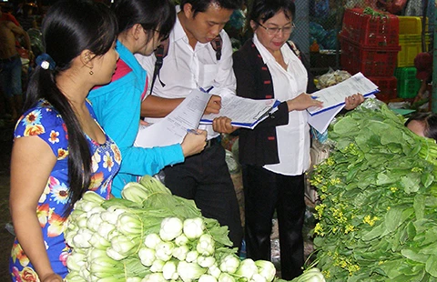 Chi cục BVTV TP.HCM đang kiểm tra nguồn gốc rau, củ đang kinh doanh ở chợ đầu mối Thủ Đức (TP.HCM). Ảnh: TRẦN NGỌC