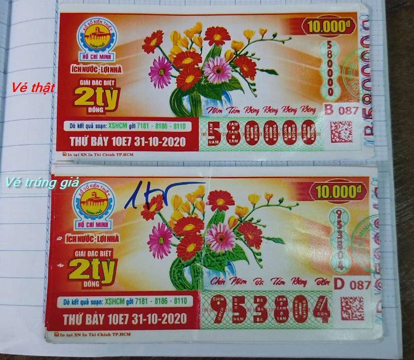 Khi ông Lý đem 5 tờ vé số trên về Phan Thiết đổi thưởng tại đại lý thì nơi này phát hiện đây là vé số giả.