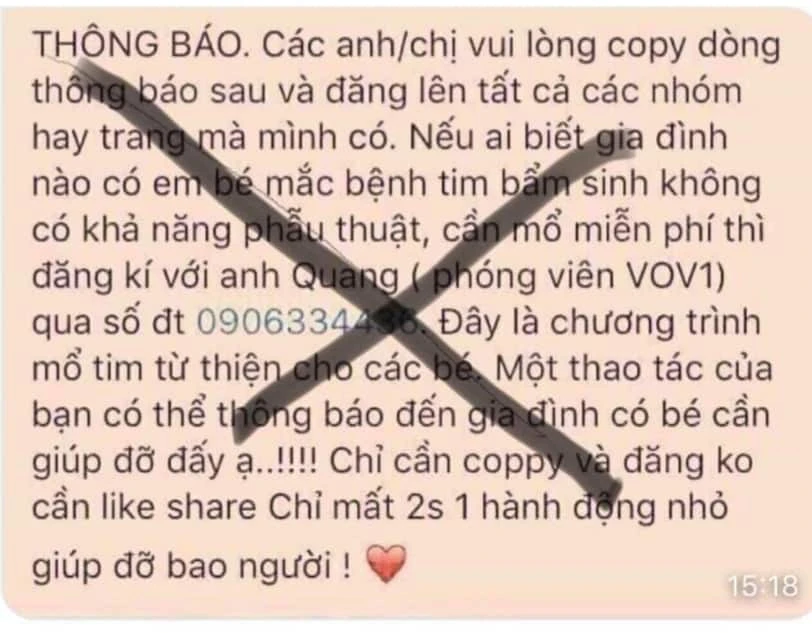 Tin nhắn có nội dung: “Nếu ai biết gia đình nào có em bé mắc bệnh tim bẩm sinh không có khả năng phẫu thuật, cần mổ miển phí thì đăng ký với anh Quang (phóng viên VOV1) qua số điện thoại 0906334xxx. Đây là chương trình mổ tim từ thiện cho các bé. Một thao tác của bạn có thể thông báo đến gia đình có bé cần giúp đỡ đấy ạ. Chỉ cần coppy và đăng không cần like chỉ mất 2 phút 1 hành động nhỏ giúp đỡ bao người”.