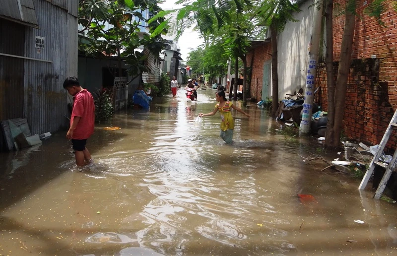 Đến đầu giờ chiều 13-10, nhiều con hẻm dọc đường Tô Ngọc Vân và đường Hà Huy Giáp (quận 12) vẫn còn bị ngập sâu. Ảnh: K.B