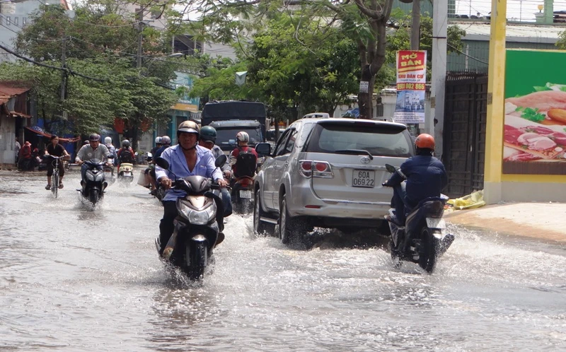 Đến đầu giờ chiều 13-10, đường Tô Ngọc Vân (quận 12) vẫn còn ngập dù tuyến đường này vừa sửa chữa nâng cấp cách đây vài tháng. Ảnh: K.B