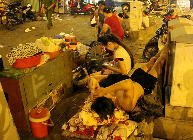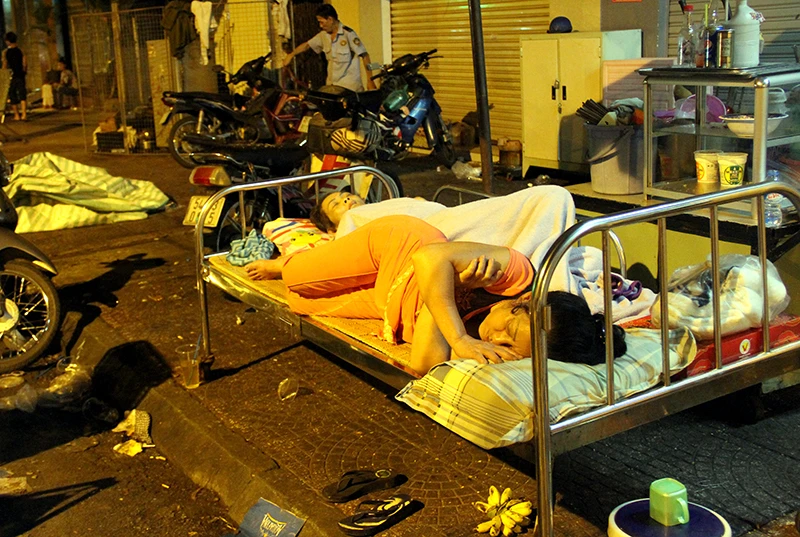 Đôi bạn trẻ ngủ tạm trên một chiếc bàn mượn của hàng xóm trên vỉa hè đường Võ Văn Kiệt