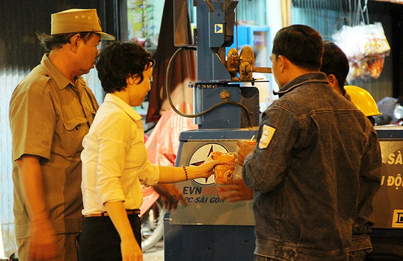 Một cán bộ phường đến hiện trường để tiếp tế thức ăn cho các nhân viên điện lực và người dân