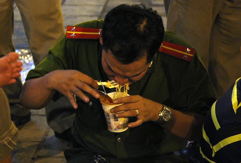 Một cảnh sát tranh thủ nuốt miếng mì để chuẩn bị túc trực, bảo vệ hiện trường và tài sản của người dân