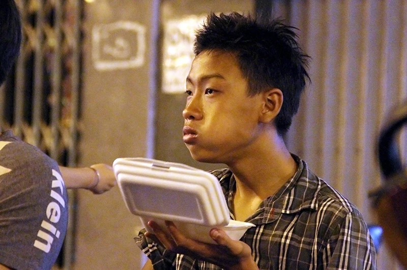 Nhà cậu bé này đã bị thiêu rụi, cậu cố gắng nuốt miếng cơm của phường gửi để ngày mai có sức có thể đi học được