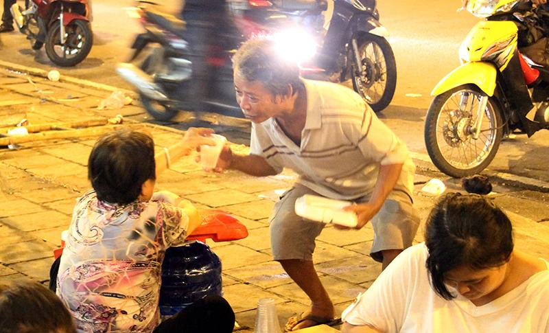 Một người đàn ông phút chốc trở thành “người vô gia cư” đang nhận cơm, nước được tiếp tế