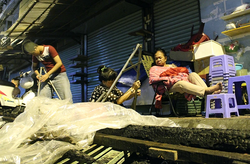 Hai mẹ con chị Hà sửa soạn một chỗ ngủ trên vỉa hè đường Yersin cùng người hàng xóm