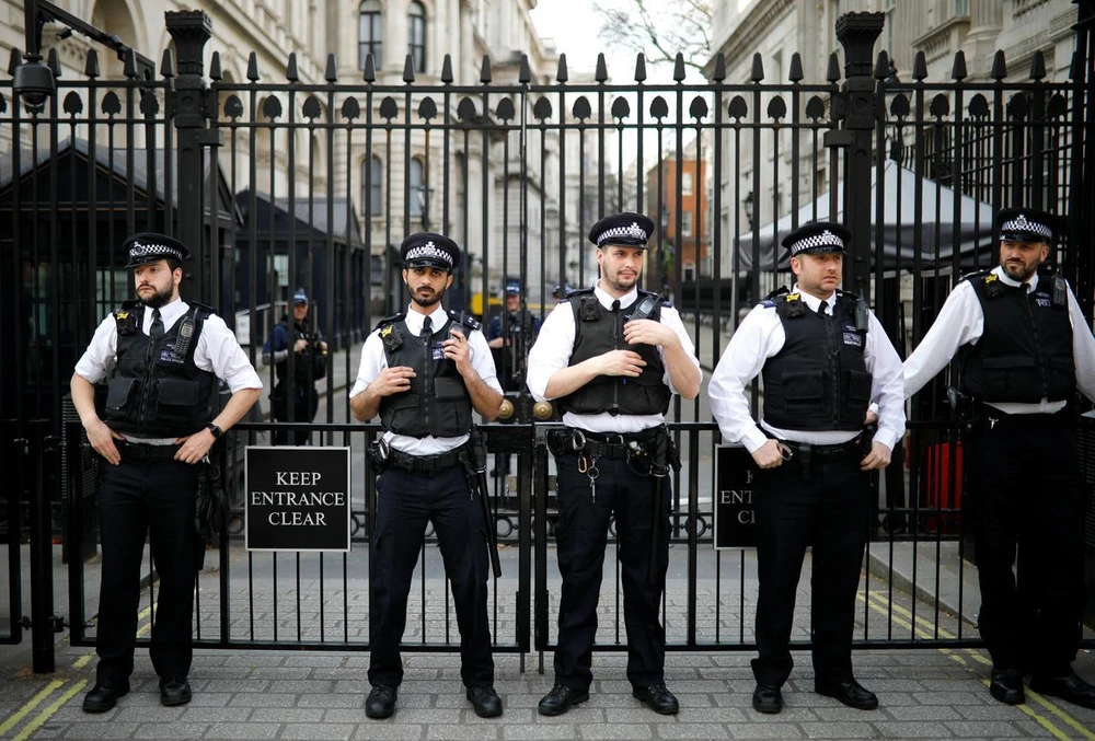 Cảnh sát Anh đang làm nhiệm vụ tại đường Downing, thủ đô London, Anh. Ảnh: REUTERS
