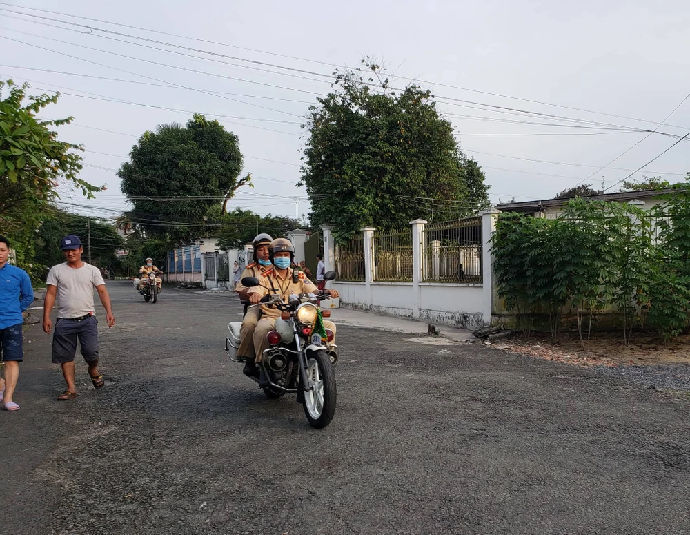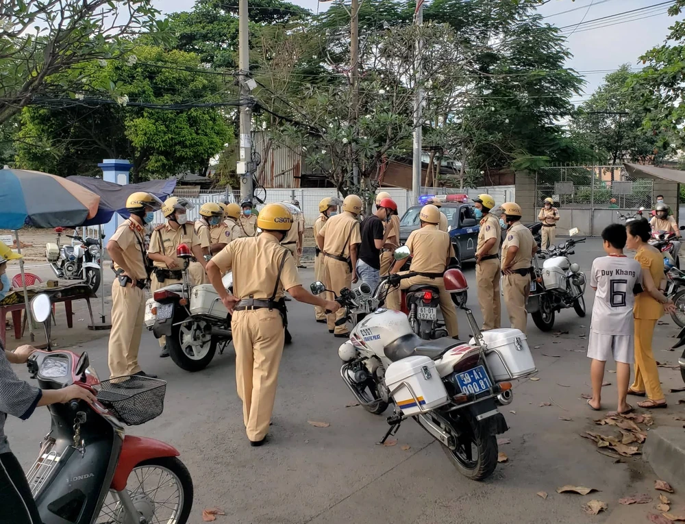 Lực lượng CSGT bao vây nơi nhóm quái xế lẩn trốn để truy tìm. Ảnh: T.S