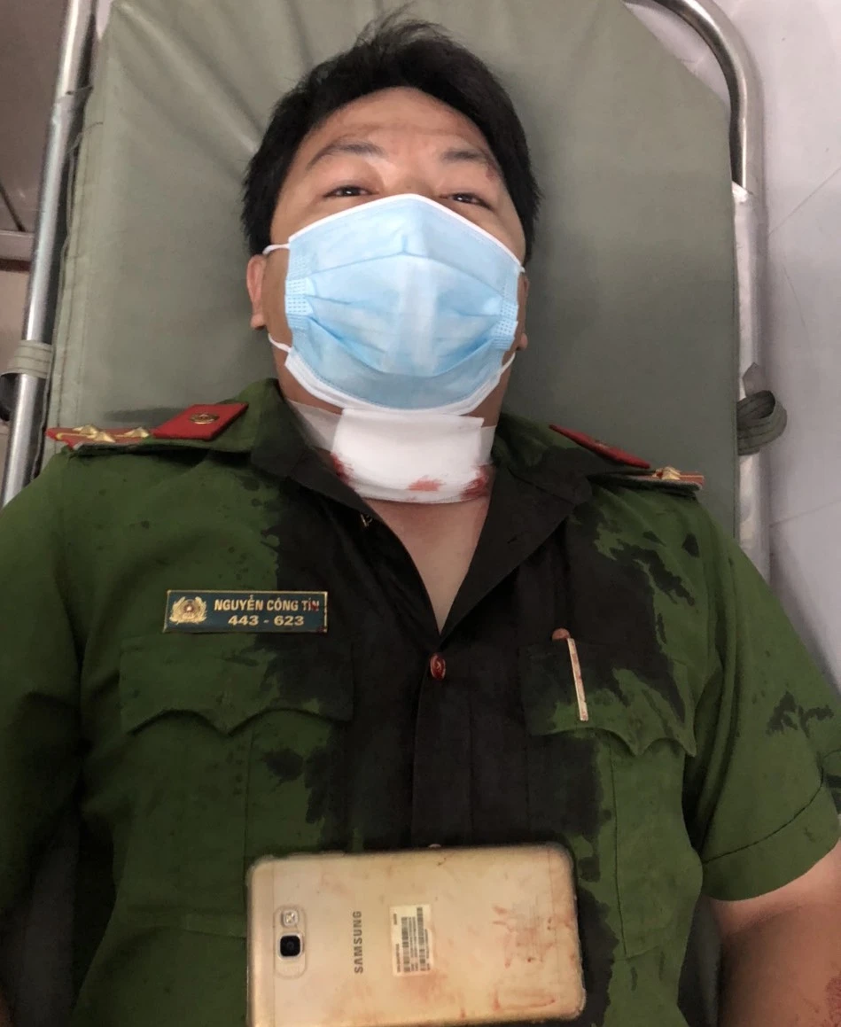 Đại úy Nguyễn Công Tín bị Quách Thái dùng dao tấn công vào vùng cổ gây thương tích. Ảnh: CACC
