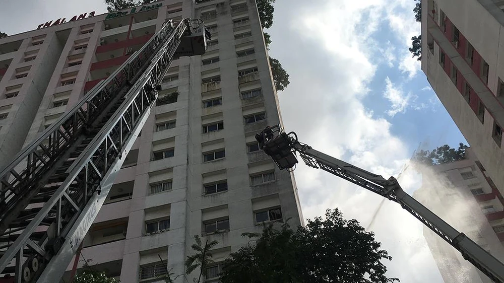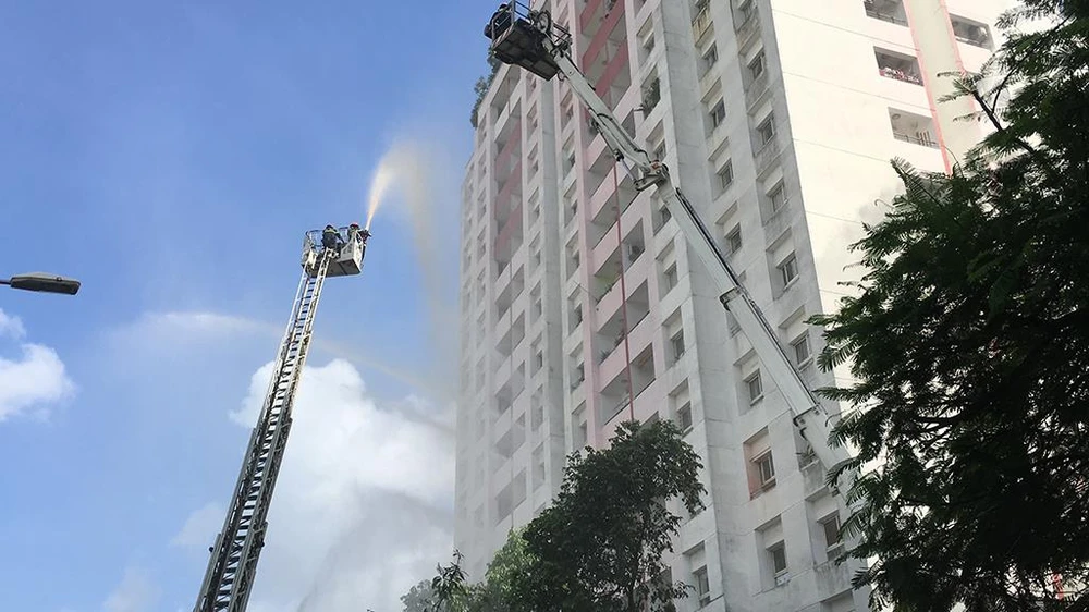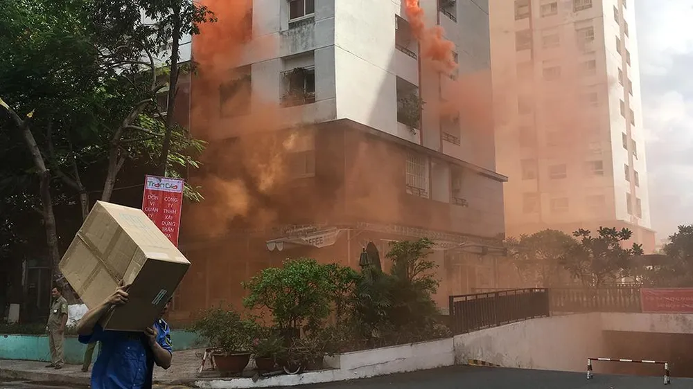 Tình huống giả định là hỏa hoạn bùng phát từ tầng cao chung cư Thái An 3 khiến nhiều người mắc kẹt. Ảnh NT.