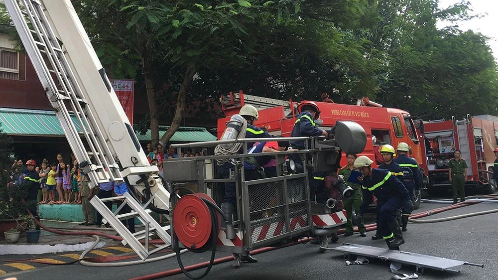 Cảnh sát PCCC quận 12 cùng sự phối hợp của quận Tân Phú nhanh chóng điều xe thang đến hiện trường trong phương án giả định. Ảnh NT.