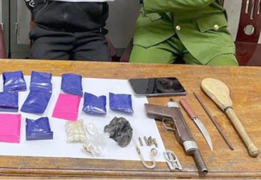 Tang vật ma túy, dao và súng bị công an thu giữ.